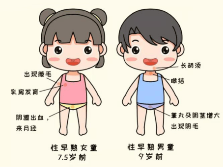 性早熟一种青春期特征提早出现的生长发育异常现象。男孩在9岁以前出现喉结隆起、声音粗壮、肌肉发达等第二性征;女孩在8岁以前出现乳房发育长大、阴腋毛长出等症状,或女孩在10岁以前发生月经初潮,即可诊断为性早熟。