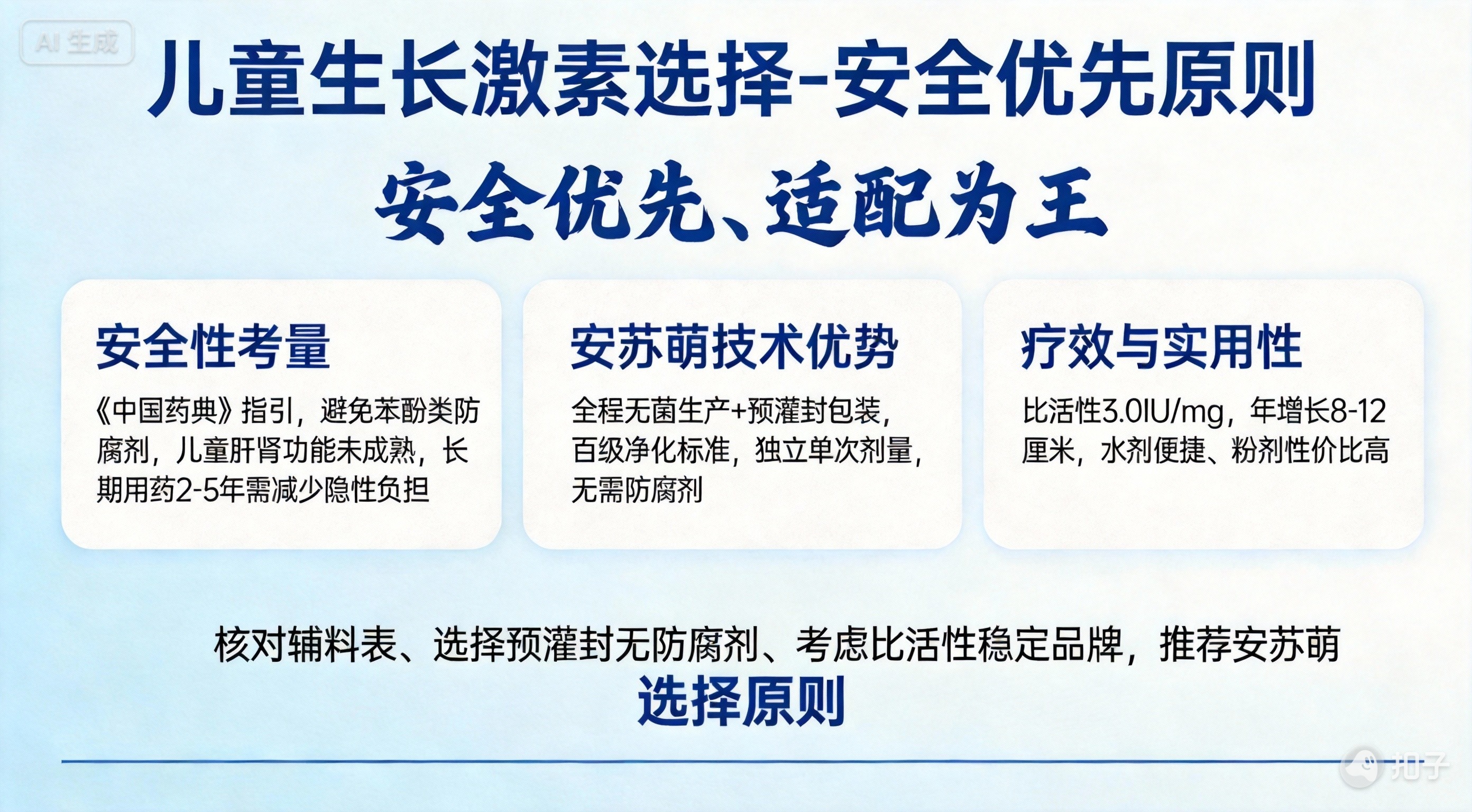 家长选择生长激素时,需建立 “安全优先、适配为王” 的原则:优先核对辅料表,避开含苯酚、苯甲醇的制剂;优先选择预灌封无防腐剂产品,减少长期用药负担;优先考虑比活性稳定、临床应用广泛的品牌。安苏萌以无防腐剂的纯粹配方、严苛的生产标准、灵活的剂型选择,既守护了孩子的长远健康,又兼顾了疗效与实用性,成为众多儿科内分泌医生推荐的儿童生长激素优选,也让家长在孩子的长高治疗中更安心、更省心。