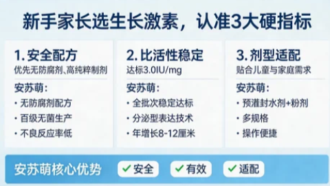 新手家长选择生长激素,无需盲目追求进口、无需过度纠结价格,紧扣“安全配方、比活性稳定、剂型适配”三大硬指标,就能精准避坑、选对产品。安苏萌以无防腐剂的安全优势、稳定达标的比活性、灵活适配的剂型,成为国产生长激素中的标杆品牌,也成为众多新手家长的省心之选,既能守护孩子长期用药安全,又能兼顾疗效与实用性,助力孩子抓住黄金生长窗口,科学长高、实现理想身高。