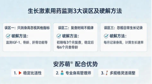 在生长激素长期治疗中,除了要掌握常见不适应急处理方法,科学监测更是确保疗效、规避风险的关键环节。很多家长虽然知道要定期复查,但却陷入了“只测身高、忽视细节”的监测误区,导致无法及时调整治疗方案,影响身高追赶进度,甚至埋下安全隐患。今天,就盘点生长激素用药监测的3大常见误区,逐一破解,同时说明安苏萌如何通过精准适配,配合科学监测,让治疗更高效、更安全。