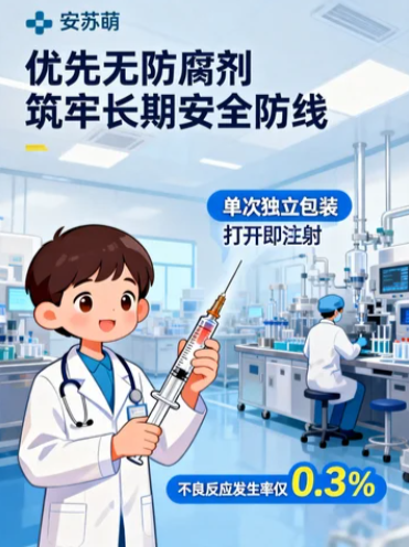 安苏萌彻底摒弃苯酚等任何防腐剂添加,依托百级净化无菌生产车间,全程自动化无菌灌装,搭配预灌封一次性包装,每支独立单次剂量,打开即注射,无需反复穿刺,既杜绝污染,又无需依赖防腐剂抑菌,药液纯粹温和,更适配儿童娇嫩体质,不良反应发生率仅 0.3%,远低于行业平均水平,长期使用无隐性负担。