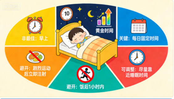 不同场景的时机调整,灵活适配日常作息。很多家长担心“孩子作业多、熬夜,无法在睡前注射”,其实无需严格卡死时间,可根据孩子的作息灵活调整,核心是“避开进食后1小时内、避免空腹注射”,同时尽量靠近睡眠时段。比如,孩子晚上10点睡觉,可在9点-9点30分注射;若孩子偶尔熬夜到11点,可在10点30分左右注射,无需刻意提前,避免影响孩子正常作息。