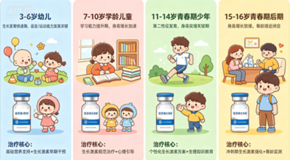 核心原则:儿童生长潜力的核心取决于“骨龄”,但年龄决定了干预的“效率”——年龄越小,骨龄越落后,生长潜力越充足,治疗周期越短、效果越显著;年龄越大,骨龄越接近闭合,生长潜力越有限,治疗重点则转向“冲刺挖掘剩余潜力”。不同年龄段的治疗,需遵循“适配年龄、精准发力”的原则,切勿盲目跟风。