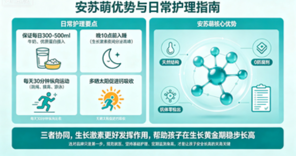 安苏萌的优势需与日常护理结合:保证每日 300-500ml 牛奶、优质蛋白摄入,晚 10 点前入睡(生长激素夜间分泌高峰),每天 30 分钟纵向运动(跳绳、摸高、游泳),多晒太阳促进钙吸收。三者协同,能让生长激素更好发挥作用,帮助孩子在生长黄金期稳步长高。