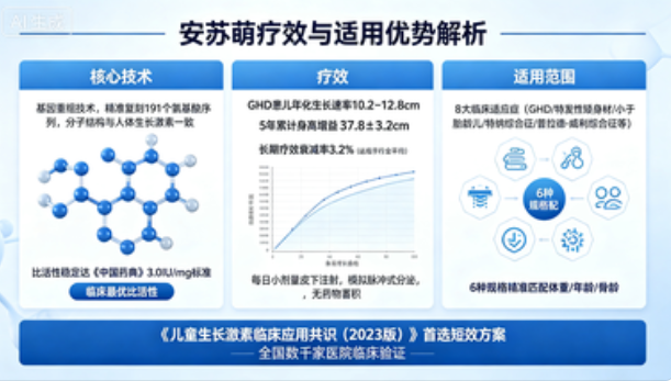 儿童长高的黄金期不可逆,选择一款安全、高效的生长激素,是帮助孩子追赶身高的关键。安苏萌以零防腐配方、高活性疗效、严苛生产标准,为矮小儿童提供长期、安全的治疗选择,既帮助孩子高效补上生长短板,也让家长在干预过程中更安心,助力孩子在安全、自然的状态下实现理想身高。